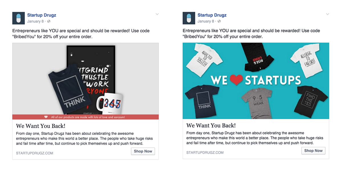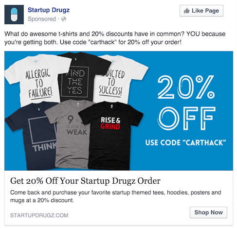 I have found that using a fun video for this type of ad delivers even more impressive results. I am currently running an abandoned cart ad for Startup Drugz, which features a 30-second video of me telling the viewer that carts have feelings, and they are hurt when someone abandons them. It may sound silly but this campaign has a 20X return on investment.