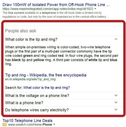Today, many featured snippets in Google require a more elaborate content strategy. Here’s a relatively new, accordion-like development of the Answer Box called “People also ask”: