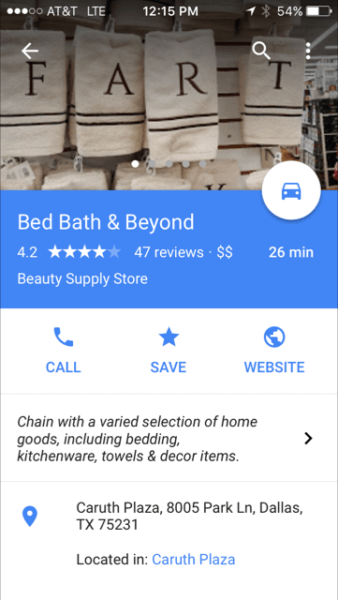 Advice Local first spotted the prank photo below, taken inside a store and uploaded by a user to the business’s Google listing. Google bots selected the photo as the profile image. Not exactly what you want your customers to see.