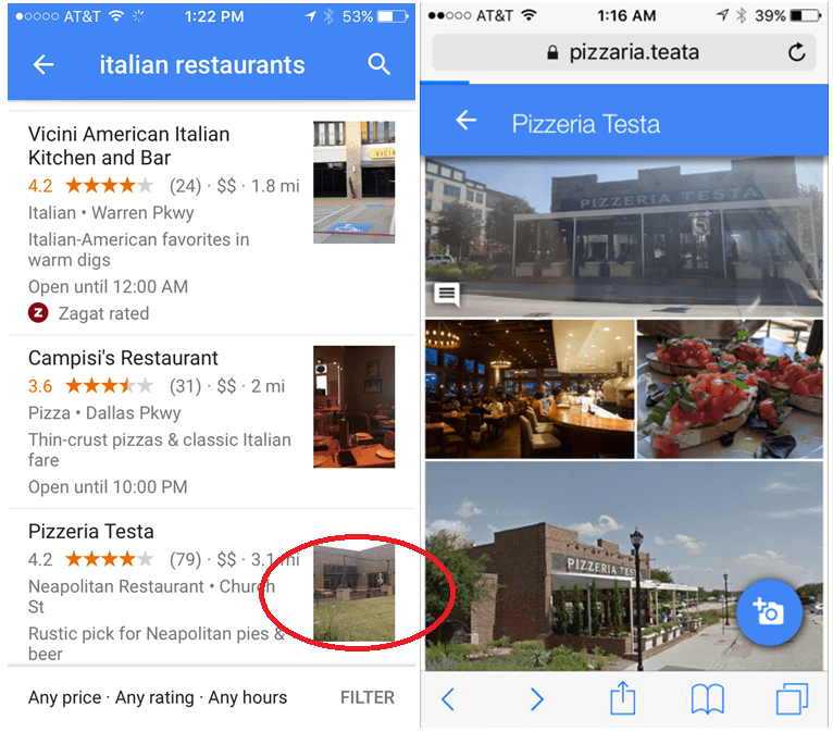 Pizzeria Testa (below) has an ugly picture of the back side of the restaurant as its profile. It needs to work to get its much nicer storefront (or any of the other images) set as its profile by trying a few changes.
