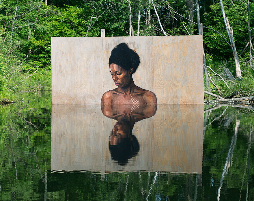 The Hawaii-born painter and street artist, who is based in NYC, uses a paddleboard to access concrete canvases that he finds in abandoned buildings. Once he finds a suitable surface, Yoro balances on his paddleboard while he patiently goes about transforming the blank wall into a stunning piece of interactive art. His new installation – called Lewa – is painted on abandoned shipping docks and depicts a woman gently reclining as if at the edge of a swimming pool. You can find more of his work on Instagram, where the artist has almost 100k followers.