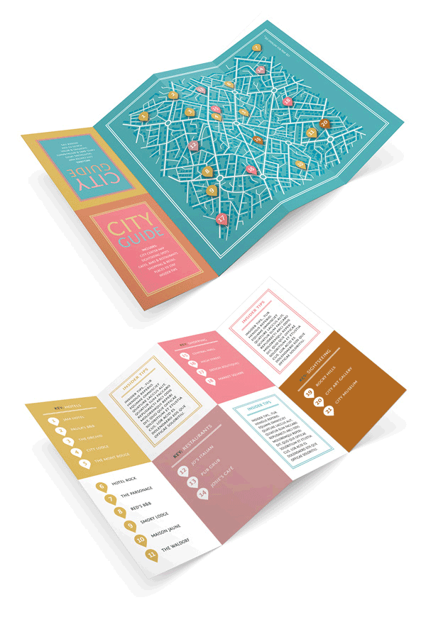 One way of doing this is to make your brochure into an unusual format or shape that people will want to keep hold of. This folded city guide is a great example of how to condense a lot of information into a format that tightly folds up and can easily be slotted into someone’s back pocket.