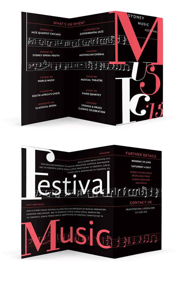 Take inspiration from this typographic brochure design—the event details inside the brochure may be at normal reading size, but the title of the event has been blown up to fill the whole cover.
