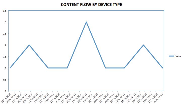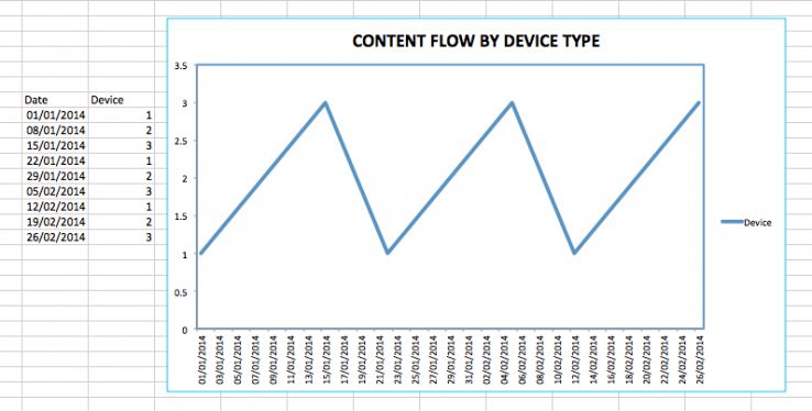 As you want to be creating content equally for all devices, you are looking for a constant flow of ideas, designed for each one. Testing this can be done in two ways; you can either create an editorial planner template that includes space specifically where you can record "by device" (and here's one we made earlier for you!) or you can assign a number to each device and chart the 'flow' of content over time, a little like this: