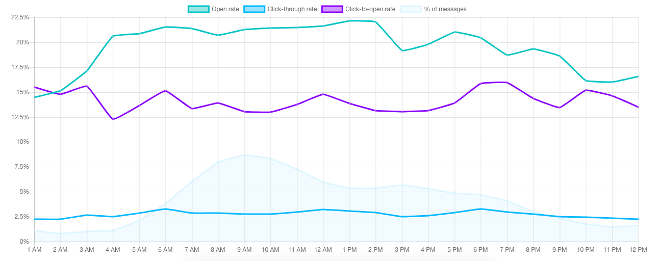 In general, the highest click-to-open rates are 10 AM, at 21%, 1 PM, at 22.5%, and have seen a spike at near 6 PM. The data reflects when most audiences begin or conclude their day and have the most time to check their emails.