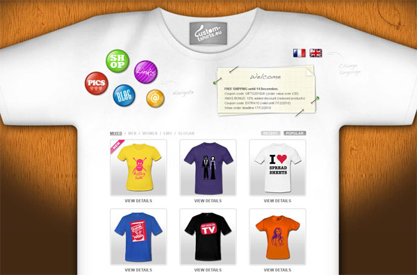 Custom Tshirts is a British company that allows customers to design their own t-shirts. The navigation buttons are placed on the t-shirt, along with other menu items further down.