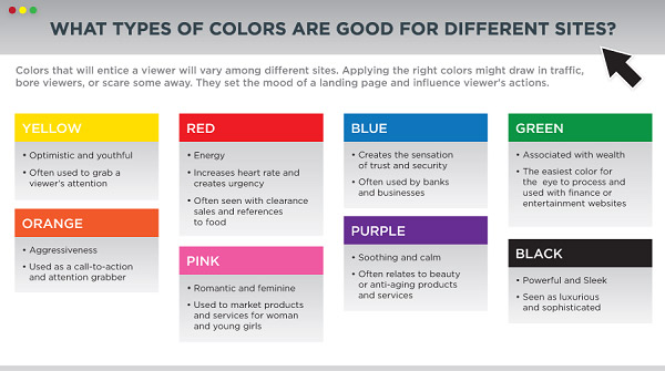 The most important element of the page is put in one of these 4 intersections. The lower intersections are below the fold, which may go against traditional design “rules,” but neuroscientists disagree. If you want more information to be seen you can use carousel and put it in the area of top two intersections. It is very common method and used widely nowadays. - Mood and Tone/Color: The design must match everything about the mood and tone of the product or service being offered. Most designers, of course, know this, but color psychology plays a major role in establishing that mood, tone, and emotions: