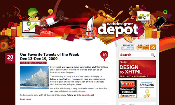 - Bleeding:This is a relatively new but worthy design element, appropriate for certain types of companies. Essentially, a pattern begins on the content page and then bleeds into a solid color background. Here is how Web Designer Depot used to have it for their own site.