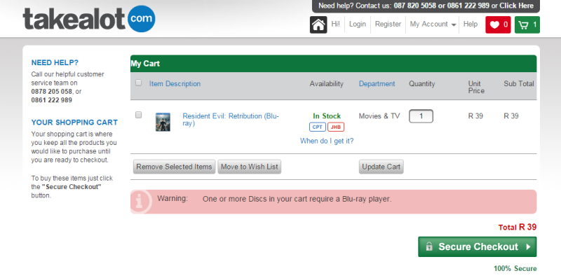 Perhaps most impressively, the Takealot cart even warns you of any necessary dependencies a product might have — for instance, a Blu-Ray disc requiring a Blu-Ray player.