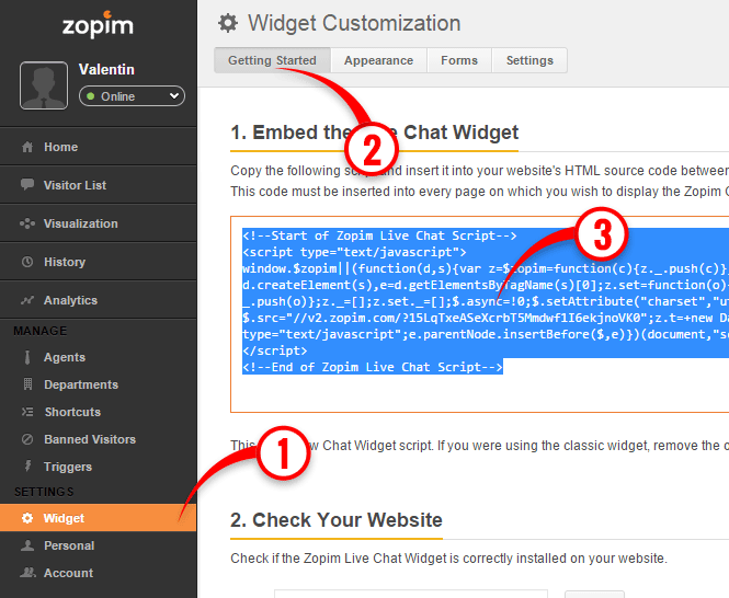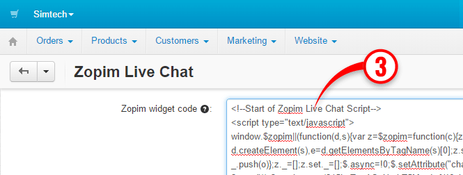 1. Please go to Zopim Dashboard > Widget > Embed the New Chat Widget and copy Zopim Live Chat Script
