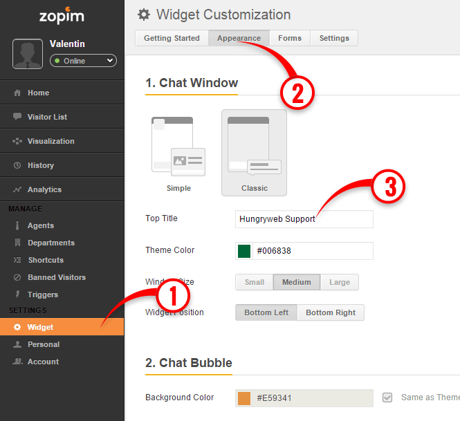 1. Please go to Zopim Dashboard > Widget > Appearance